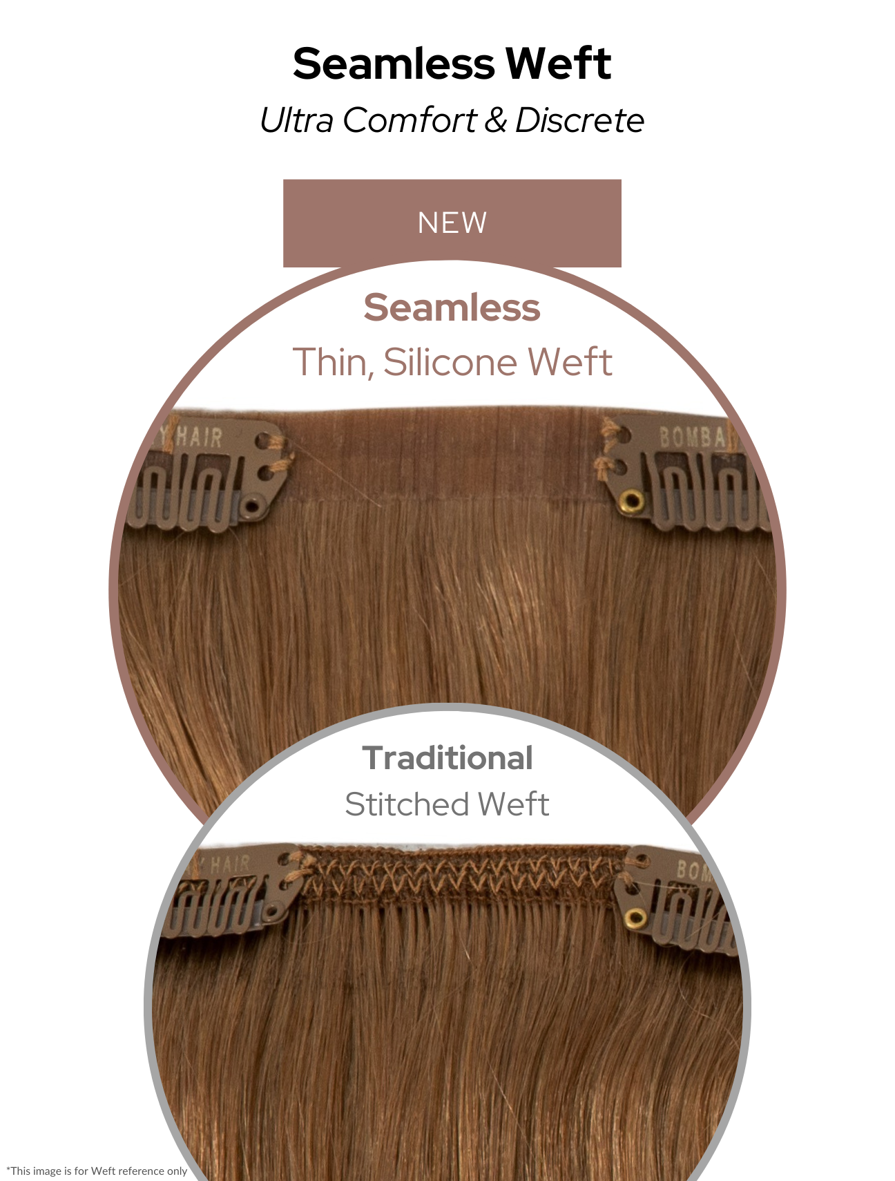 Bombay Hair Seamless Clip-in Hair Extensions are made with thin silicone wefts that lay flat on your head for the most comfortable wear while seamlessly blending in with your scalp. Unlike other seamless extensions, our double-drawn hair has 100% cuticle intact, ensuring tangle-free, smooth, and voluminous hair.