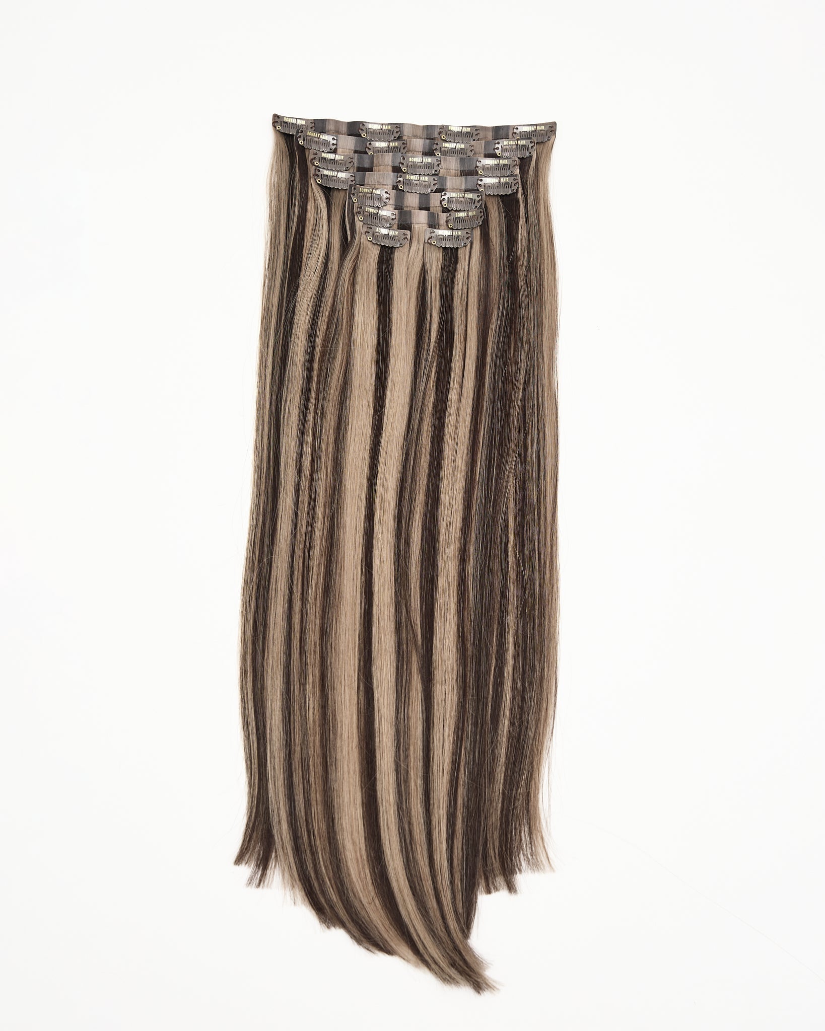 Introducing, Bombay Hair Seamless Clip in Hair Extensions in shade Espresso Ash Brown Highlights. The same amazing hair quality, but now made with thin silicone wefts that lay flat on your head, for the most comfortable wear.