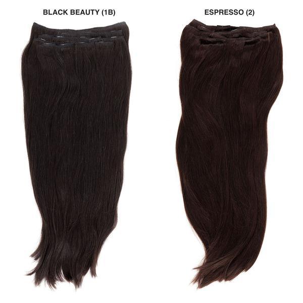 Our best-selling Off Black clip-in extensions feature a soft, natural black shade with subtle brown undertones — perfect for those who want a rich, dark look without the harshness of jet black. Flattering on most skin tones, this versatile color blends seamlessly with naturally dark hair, offering a polished, full-bodied finish with effortless dimension.